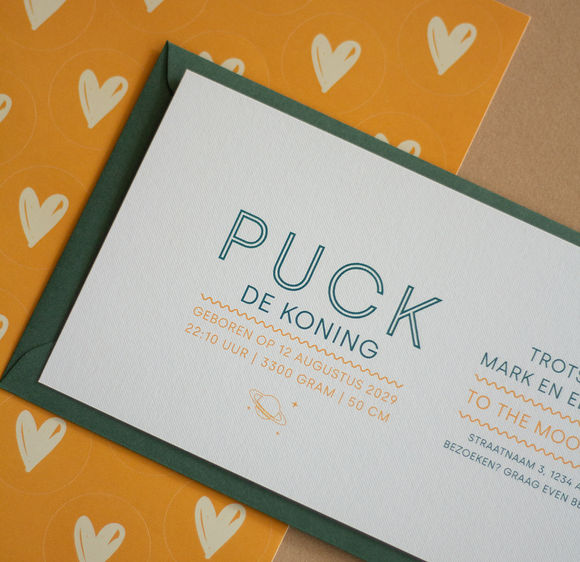 Vrolijk geboortekaartje PUCK - Okergeel met retro vibes