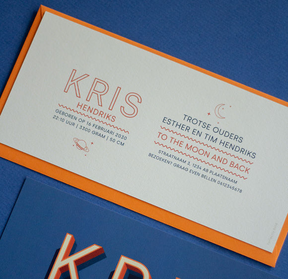 Dit geboortekaartje mixt retro kleuren met moderne typografie. Het blauw-oranje duo is niet alleen creatief een mooie combinatie, maar onze ogen vinden het heel fijn om deze complementaire kleuren samen te zien. Een creatieve match die ook visueel gewoon klopt. Complementair, fris en verrassend vertrouwd.