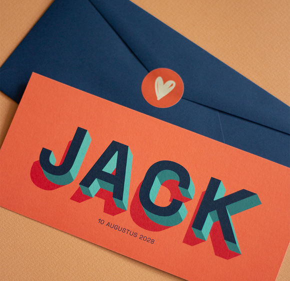 Dit opvallend geboortekaartje spat van het papier met een knalkleurige oranje achtergrond en 3D-letters in turquoise blauw. Stoerder, spannender en gedurfder krijg je het niet. Met geboortekaartje Jack verras je je omgeving pas écht!