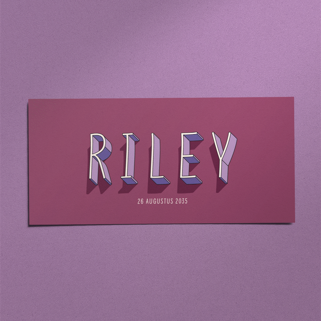 De donkere plumkleur geeft dit geboortekaartje een stoere basis. Daarop springen de lavendelkleurige 3D-letters echt van het papier. Bold en strak, maar toch speels door de handgeschreven look van de letters.